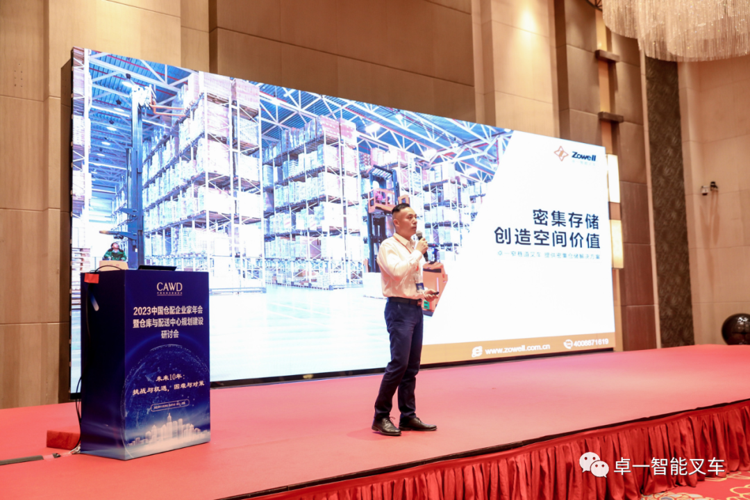 卓一智能叉車派出公司代表從科學(xué)擴(kuò)容、提升倉(cāng)儲(chǔ)效益角度出發(fā),發(fā)表了“密集存儲(chǔ)創(chuàng)造空間價(jià)值”主題演講。