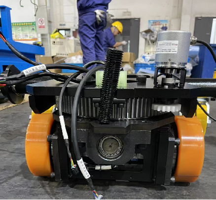 杭叉智能通過(guò)縮減轉(zhuǎn)向電機(jī)負(fù)載,控制工作電流大小,利用差速單元的原理,設(shè)計(jì)搭配兩個(gè)伺服電機(jī),通過(guò)轉(zhuǎn)速差實(shí)現(xiàn)整車(chē)轉(zhuǎn)向,做到“大車(chē)身,小轉(zhuǎn)彎”;并且持續(xù)優(yōu)化,設(shè)置差速分離結(jié)構(gòu),使AGV在一側(cè)輪打滑的情況下也能行走。