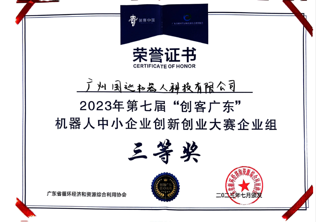 2023年7月11日,廣東省舉辦的第七屆“創(chuàng)客廣東”機(jī)器人中小企業(yè)創(chuàng)新創(chuàng)業(yè)大賽落下帷幕,廣州國巡機(jī)器人科技有限公司的“復(fù)雜且惡劣場景多功能智慧安全巡檢機(jī)器人開創(chuàng)者”項(xiàng)目榮獲企業(yè)組三等獎(jiǎng)。