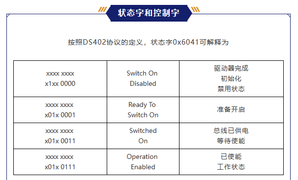 那么用于更改驅(qū)動器狀態(tài)的控制字0x6040,就需要根據(jù)當(dāng)前狀態(tài)字的內(nèi)容,進行分步設(shè)置。