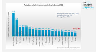 日本排名第四(397 臺)。全球主要機器人制造國的機器人密度每年平均增長7%(2017-2022年)。