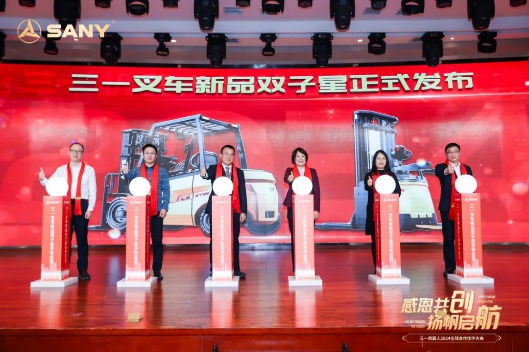新品雙子星正式發(fā)布,三一集團(tuán)副總經(jīng)理、三一機(jī)器人科技有限公司董事長郭承志,中國工程機(jī)械工業(yè)協(xié)會工業(yè)車輛分會秘書長張潔,中國移動機(jī)器人產(chǎn)業(yè)聯(lián)盟秘書長李進(jìn)科,中國倉儲與配送協(xié)會副秘書長郁士美,三一機(jī)器人科技有限公司總經(jīng)理吳名陵,三一機(jī)器人科技有限公司副總經(jīng)理、電動叉車項目總經(jīng)理馮振禮共同按下啟動鍵,三一新品雙子星正式發(fā)布。