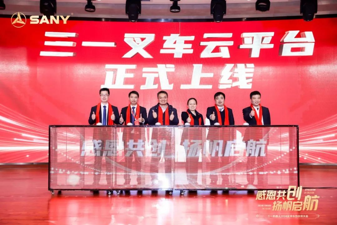 三一電動叉車智能云平臺上線儀式同期舉行,三一機(jī)器人副總經(jīng)理胡柱、AGV研究院院長翁艷、武漢動力電池再生技術(shù)有限公司董事長張宇平、三一機(jī)器人電動叉車營銷總監(jiān)鄒傳林、電動叉車研究所所長魏曉曉、電動叉車研究所所長李紅雨上臺共同見證榮耀時刻。