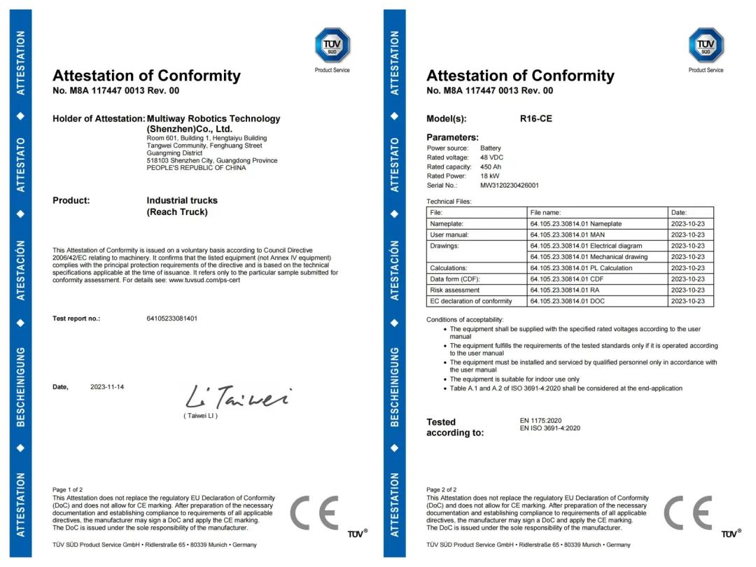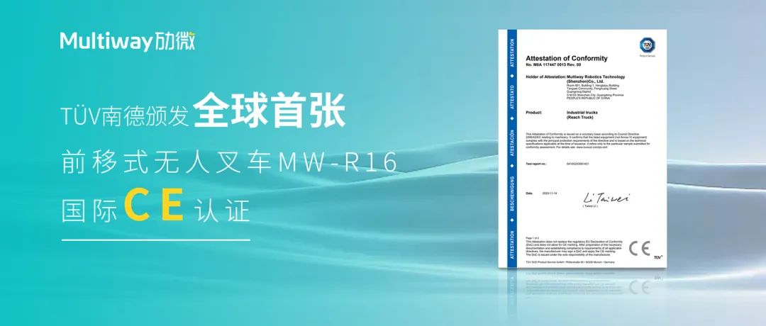 勱微機(jī)器人前移式無人叉車MW-R16,獲得TüV頒發(fā)的CE認(rèn)證。TüV南德意志集團(tuán)是全球規(guī)模最大、安全等級(jí)檢查最嚴(yán)格、最權(quán)威的TüV檢驗(yàn)機(jī)構(gòu),勱微機(jī)器人的前移式無人叉車MW-R16,也是全球首個(gè)通過該集團(tuán)CE認(rèn)證的前移式無人叉車。