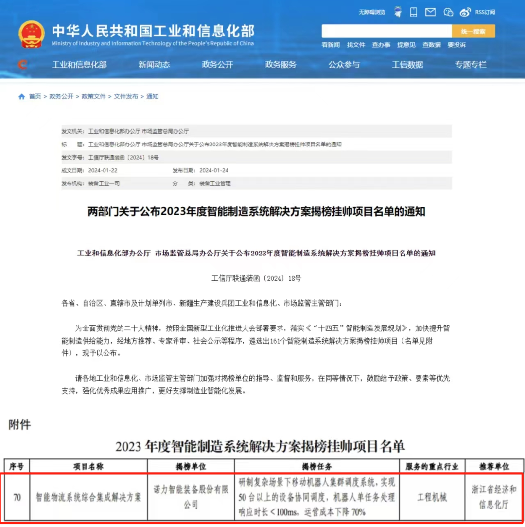 2024年1月24日,2023年度智能制造系統(tǒng)解決方案揭榜掛帥項目名單正式公布,諾力智能裝備股份有限公司憑借良好的智能制造系統(tǒng)解決方案技術創(chuàng)新和實施應用基礎,榮摘“智能物流系統(tǒng)綜合集成解決方案”項目。