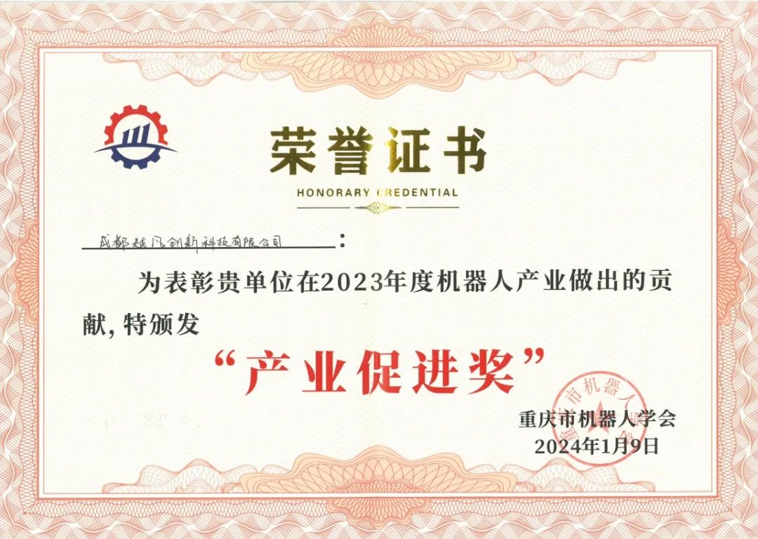 此外,在近日由重慶機器人學會、中國科學院重慶綠色智能技術研究院聯合主辦的“AI機器人技術創(chuàng)新發(fā)展論壇暨2023年度重慶市機器人學會年會”上,成都越凡創(chuàng)新科技有限公司憑借在2023年度機器人產業(yè)的突出貢獻,榮獲“產業(yè)促進獎”;公司聯合創(chuàng)始人——周星宇,榮獲“團體標準專家?guī)鞂<摇逼笗?/strong>