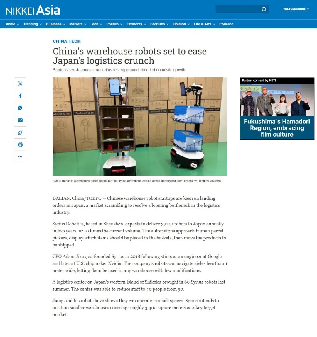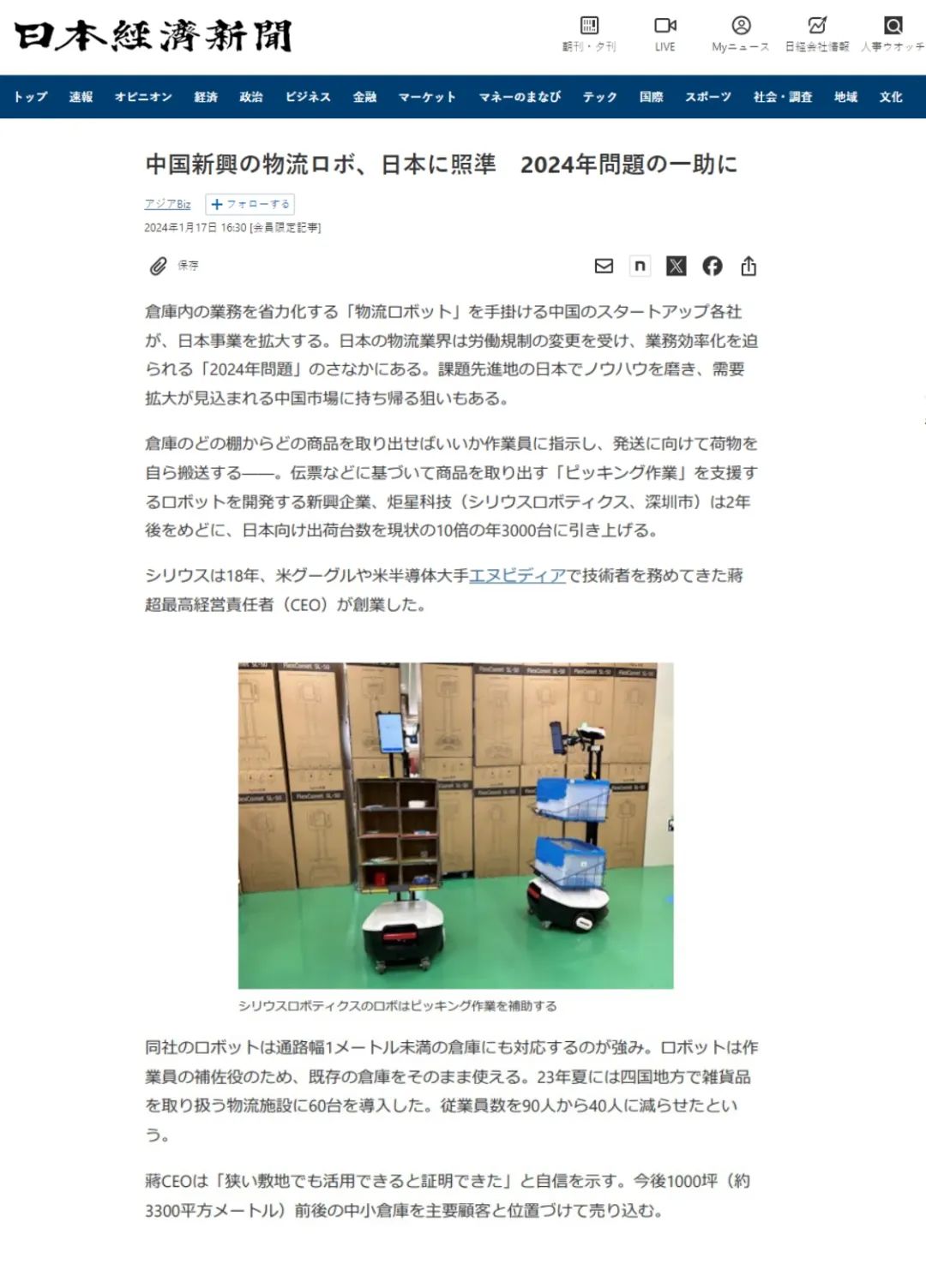 日前,日本經(jīng)濟(jì)新聞、Nikkei Asia等多家海外知名媒體報(bào)道了Syrius炬星科技深耕日本物流行業(yè)的發(fā)展現(xiàn)狀及未來規(guī)劃,并重點(diǎn)強(qiáng)調(diào)了炬星科技AMR的“人機(jī)協(xié)作”模式、“支持窄巷道通行”特點(diǎn),以及幫助日本倉(cāng)儲(chǔ)物流,特別是中小倉(cāng)庫(kù)緩解物流緊張,實(shí)現(xiàn)效率升級(jí)。