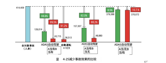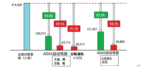 假設自動駕駛和 ADAS(高級駕駛員輔助系統(tǒng))的運行率均為 100%,其中 ADAS 包括減少碰撞損害制動和右轉偏離控制、車道保持輔助和車道保持支持控制系統(tǒng)、后方車輛監(jiān)測系統(tǒng)和后方接近車輛警報系統(tǒng),自動駕駛包括能見度。通信功能(V2X)的有無也在考慮之列,該功能可在發(fā)生障礙等情況時發(fā)揮作用。