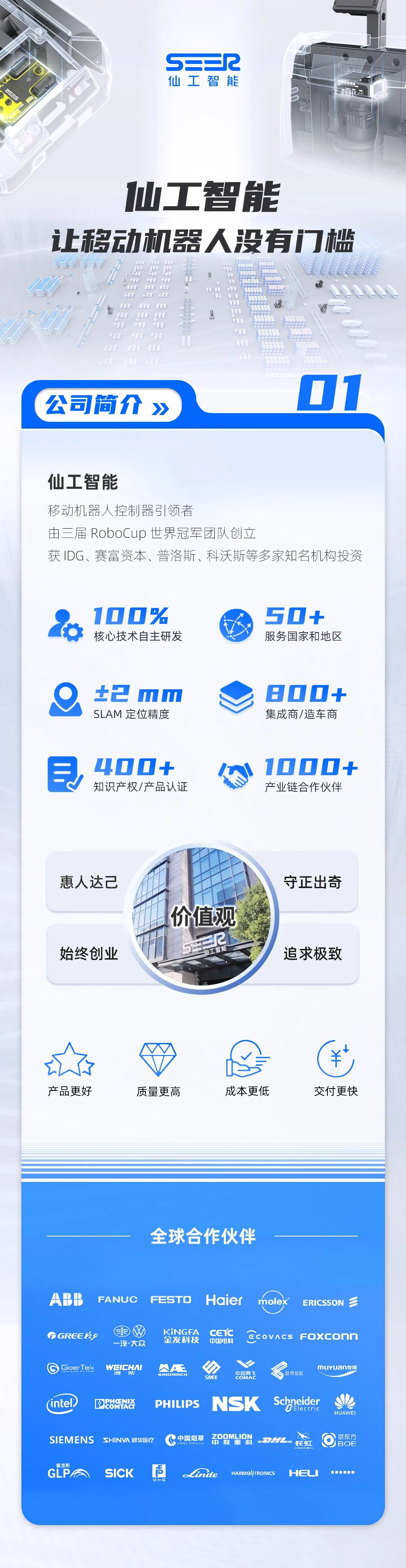 以【惠人達(dá)己,守正出奇,始終創(chuàng)業(yè),追求極致】的品牌價(jià)值觀為導(dǎo)向,憑借卓越的產(chǎn)品力、方案力與服務(wù)力,仙工智能為西門子、菲尼克斯、濰柴動(dòng)力、格力等全球 800 多家企業(yè)提供服務(wù)。客戶覆蓋半導(dǎo)體、3C、鋰電、光伏、汽車零部件、PCB、紡織、醫(yī)療等行業(yè),項(xiàng)目交付率達(dá) 100%。仙工智能,以實(shí)力引領(lǐng)工業(yè)物流智能化進(jìn)程。