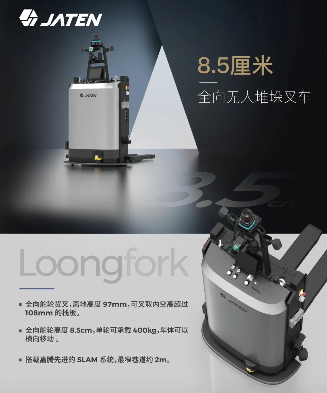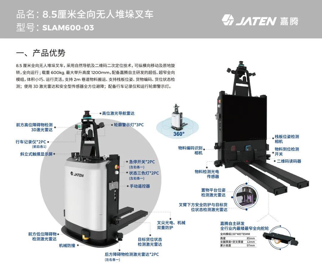 蝶變,百煉成鋼新品誕生。嘉騰機(jī)器人重磅推出8.5厘米全向無(wú)人堆垛叉車(chē),超薄超窄,靈動(dòng)高效!采用自然導(dǎo)航及二維碼二次定位技術(shù),可縱橫向移動(dòng)及原地旋轉(zhuǎn),全向運(yùn)行;載重600KG;最大舉升高度1200mm;配備嘉騰自主研發(fā)的超低、超窄全向模組,體積小巧、運(yùn)行靈活,支持2M巷道物料搬運(yùn);支持棧板位姿、貨物編碼、貨位狀態(tài)檢測(cè);使用3D 激光雷達(dá)和安全型傳感器全方位避障;還配備了行車(chē)記錄儀和運(yùn)行輪廓警示燈,安全可靠。