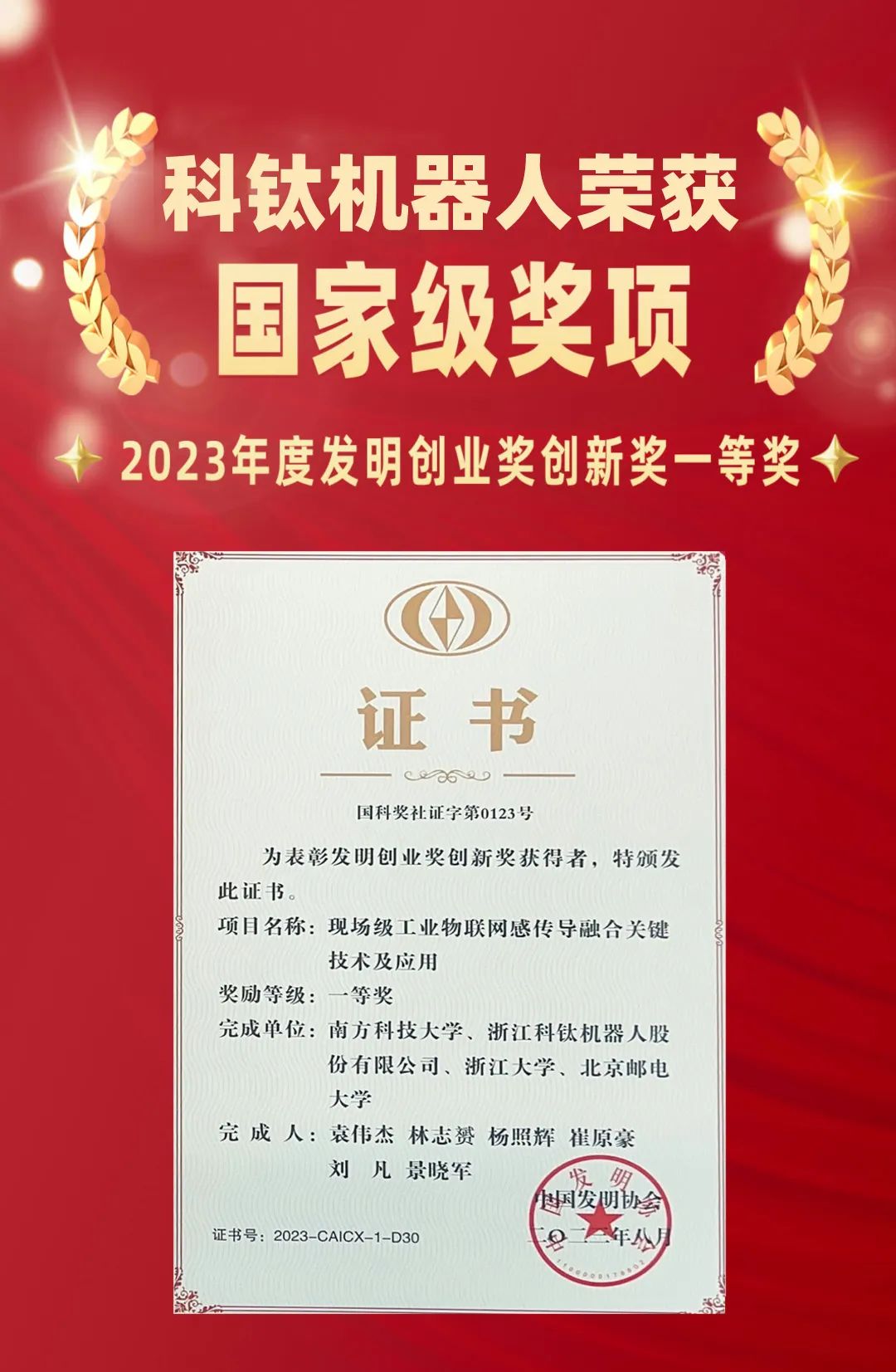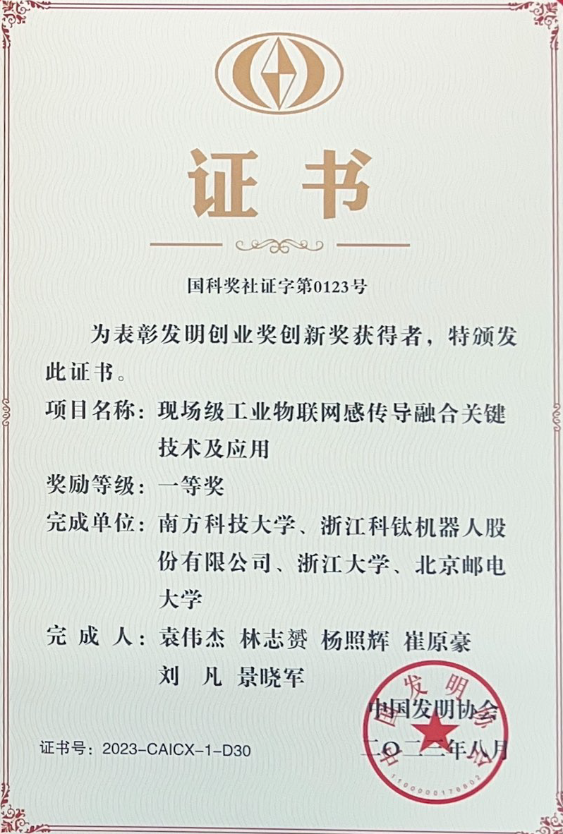 根據(jù)中國發(fā)明協(xié)會公布2023年度發(fā)明創(chuàng)業(yè)獎創(chuàng)新獎評審結(jié)果,由南方科技大學、浙江科鈦機器人股份有限公司、浙江大學、北京郵電大學聯(lián)合完成的“現(xiàn)場級工業(yè)物聯(lián)網(wǎng)感傳導融合關(guān)鍵技術(shù)及應用”項目,榮獲中國發(fā)明協(xié)會2023年度發(fā)明創(chuàng)業(yè)獎創(chuàng)新獎一等獎!科鈦機器人創(chuàng)始人林志赟作為項目第二完成人也共同獲得此榮譽。