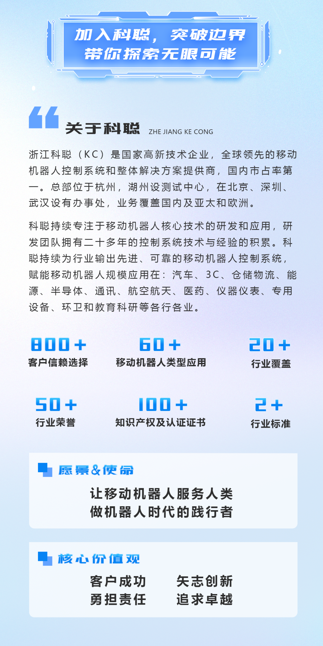 浙江科聰智能科技有限公司,是國內(nèi)領(lǐng)先的機(jī)器人核心控制系統(tǒng)和整體解決方案提供商。公司成立于2015年,位于美麗杭州的錢塘江畔。 公司致力于為市場(chǎng)提供一流的具有國際競(jìng)力的機(jī)器人技術(shù)、產(chǎn)品和解決方案。公司產(chǎn)品廣泛應(yīng)用于無人巡檢、倉儲(chǔ)、物流、安保巡邏、清潔、工程車輛、農(nóng)業(yè)機(jī)械等眾多領(lǐng)域。 公司技術(shù)實(shí)力強(qiáng)勁,擁有移動(dòng)機(jī)器人全方位技術(shù)研發(fā)、產(chǎn)品化和工程化能力,覆蓋機(jī)器人技術(shù)相關(guān)機(jī)械、電路、軟件、算法、電氣、整機(jī)集成交叉學(xué)科全領(lǐng)域。 核心團(tuán)隊(duì)成員均為從業(yè)10年以上的機(jī)器人、自動(dòng)化和人工智能行業(yè)技術(shù)專家。 公司依托浙江大學(xué)、清華大學(xué)和中國科技大學(xué)等國內(nèi)高校平臺(tái),并在國際范圍內(nèi)與美國卡耐基梅隆大學(xué)、德國德累斯頓大學(xué)、慕尼黑工業(yè)大學(xué)、美國硅谷的人工智能技術(shù)團(tuán)隊(duì)達(dá)成了伙伴合作關(guān)系。 公司已掌握智能移動(dòng)機(jī)器人基于多傳感器融合的環(huán)境學(xué)習(xí)與精確定位技術(shù)、動(dòng)態(tài)路徑規(guī)劃與精確軌跡跟蹤技術(shù)、移動(dòng)機(jī)器人多軸協(xié)同高效平穩(wěn)控制技術(shù)、基于深度學(xué)習(xí)與智能云的數(shù)據(jù)挖掘技術(shù)、多智能體分布式協(xié)作技術(shù)、特種環(huán)境防護(hù)技術(shù)與本質(zhì)安全防爆技術(shù)等一系列國內(nèi)領(lǐng)先國際一流的技術(shù)。 公司產(chǎn)品體系圍繞具有國際領(lǐng)先水平的自主導(dǎo)航技術(shù)、運(yùn)動(dòng)底盤技術(shù),輔以數(shù)據(jù)智能分析技術(shù)和執(zhí)行機(jī)構(gòu)精確操作技術(shù),讓機(jī)器人多樣化適應(yīng)惡劣環(huán)境,能可靠、安全、可控和靈活運(yùn)用并全面代替人工作業(yè)。 公司核心產(chǎn)品為低速無人駕駛和移動(dòng)機(jī)器人控制系統(tǒng),包括高集成度的控制系統(tǒng)、安全防護(hù)模塊、定位導(dǎo)航軟件、圖像識(shí)別軟件、機(jī)器人設(shè)計(jì)軟件、交通管理軟件和大數(shù)據(jù)運(yùn)維管控平臺(tái)等完備的機(jī)器人軟硬件系列產(chǎn)品。 可為用戶提供標(biāo)準(zhǔn)化解決方案和差異化應(yīng)用的定制服務(wù),為移動(dòng)機(jī)器人廠商、工業(yè)自動(dòng)化集成商和終端用戶快速推出產(chǎn)品和解決方案,響應(yīng)市場(chǎng)需求提供可靠產(chǎn)品與全面技術(shù)支撐。