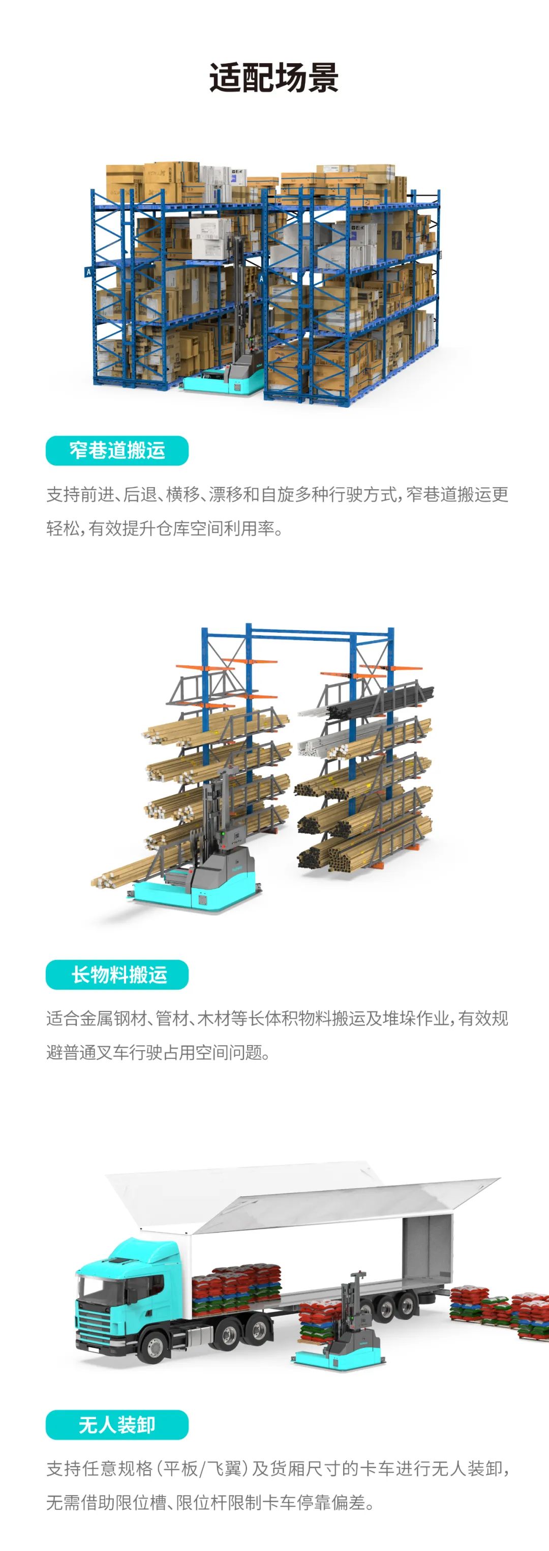 全向側(cè)叉式無人叉車,具有平移行駛、旋轉(zhuǎn)和側(cè)向行駛的能力,因此它也被稱為全向式無人叉車。相比其他類型無人叉車,全向側(cè)叉式無人叉車更靈活、高效,適用于狹窄、復(fù)雜的作業(yè)環(huán)境。廣泛應(yīng)用于機械制造、汽車零配件、食品、化工、新材料、醫(yī)療等領(lǐng)域。