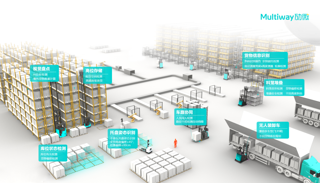 天眼系統(tǒng)極大提高了移動機器人環(huán)境適應能力,提升物流與信息流的匹配度,如“托盤姿態(tài)識別”、“料籠堆疊”、“高位存儲”、“庫位檢測”、“視覺盤點”、“無人裝卸車”等核心復雜場景適應技術,極大提高了智能物流解決方案柔性化能力。