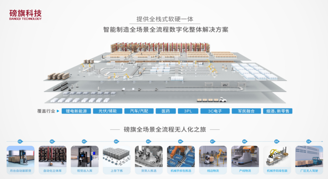 磅旗科技專注于智慧工廠全棧式全場景全流程智慧物流服務(wù),全方位涵蓋產(chǎn)線物流數(shù)字化、線邊物流數(shù)字化、倉儲物流數(shù)字化、園區(qū)物流無人化,包括月臺自動裝卸貨、自動化立體庫存儲、自動化平庫、產(chǎn)線線內(nèi)配送、AGV線邊搬運(yùn)、成品下倉、廠(倉)間物流無人駕駛(產(chǎn)業(yè)園、物流園)內(nèi)的智慧工廠全場景。