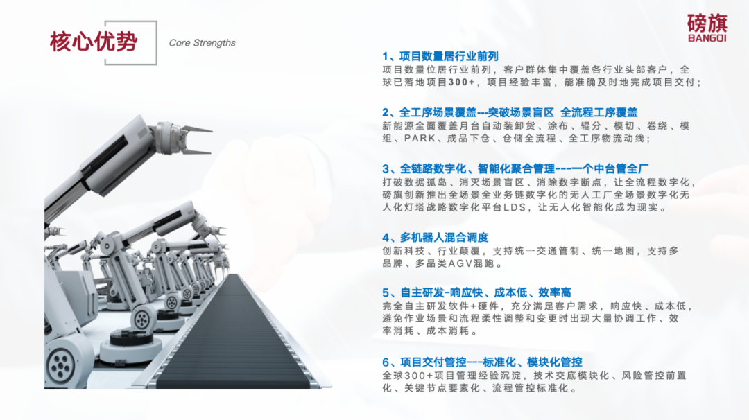 深圳市磅旗科技智能發(fā)展有限公司成立于2013年,注冊資本5000萬,是一家為智能制造數(shù)字中臺為核心,構(gòu)建智慧工廠全域物聯(lián)網(wǎng)平臺,提供全棧式軟硬一體從倉儲物流到產(chǎn)線物流、線邊物流的全場景全流程自動化數(shù)字化物流整體解決方案。