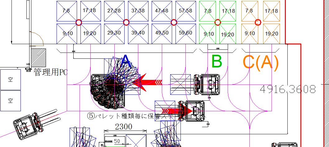 在近萬平的后段工序中,分為梱包區(qū)域、成品暫存區(qū)、自動裝車區(qū)三大區(qū)域,成品從輸送線出料口,通過光電檢測識別物料托盤種類,無人叉車自動運送至捆包區(qū)打包。完成打包,人工通過按鈕盒呼叫無人叉車取料,將貨物運送至成品暫存區(qū)分區(qū)堆疊存放。最后,通過導入天眼系統(tǒng),檢測庫位狀態(tài)(庫位有無貨物)及貨物堆疊層數(shù),反饋WMS,觸發(fā)無人叉車進行自動裝卸。
