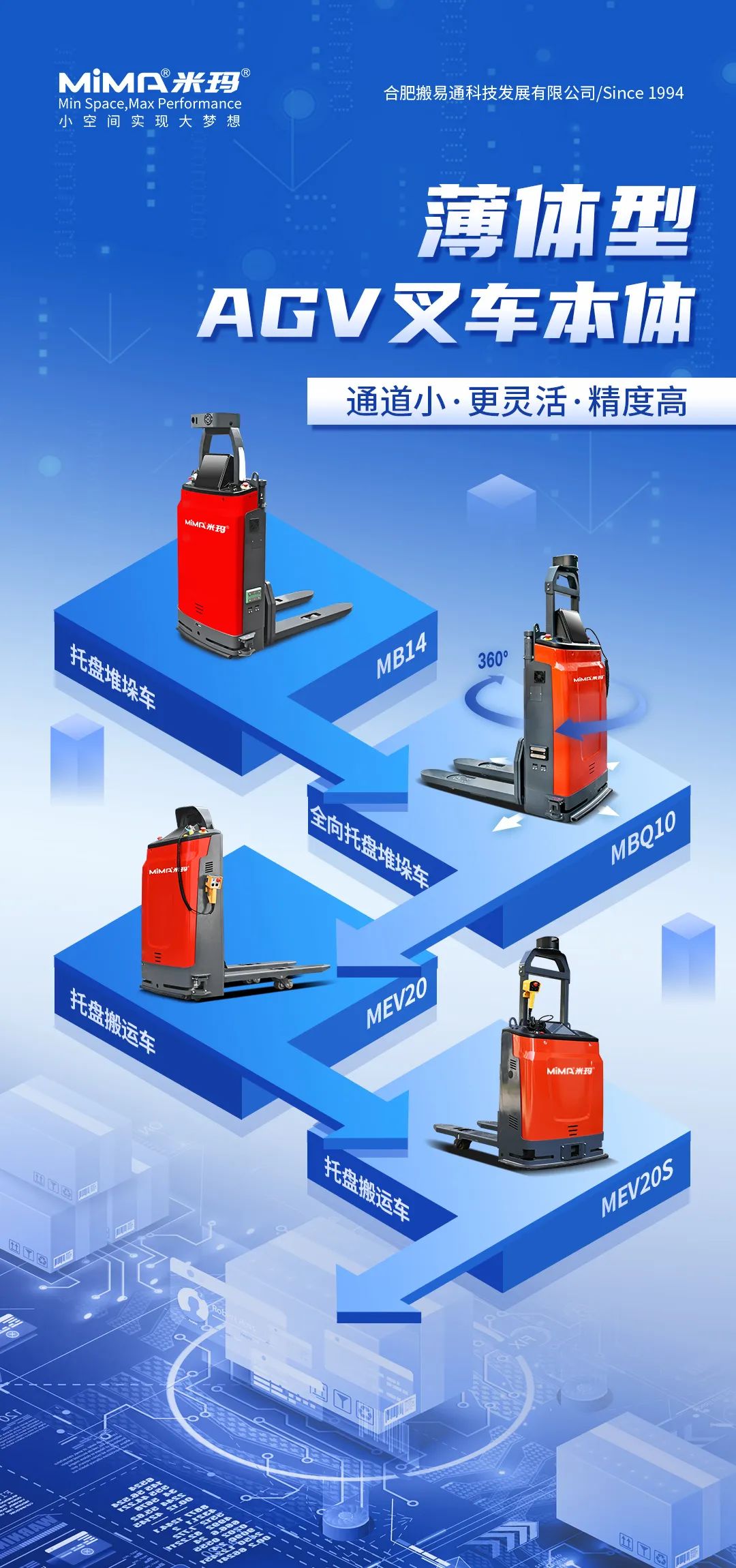 MiMA米瑪推出系列化薄體AGV搬運車及堆垛車,滿足倉庫內(nèi)窄通道、多樓層、中短途物料智能搬運及堆垛,高效、精準(zhǔn)、安全、環(huán)保、經(jīng)濟(jì)價值高。
