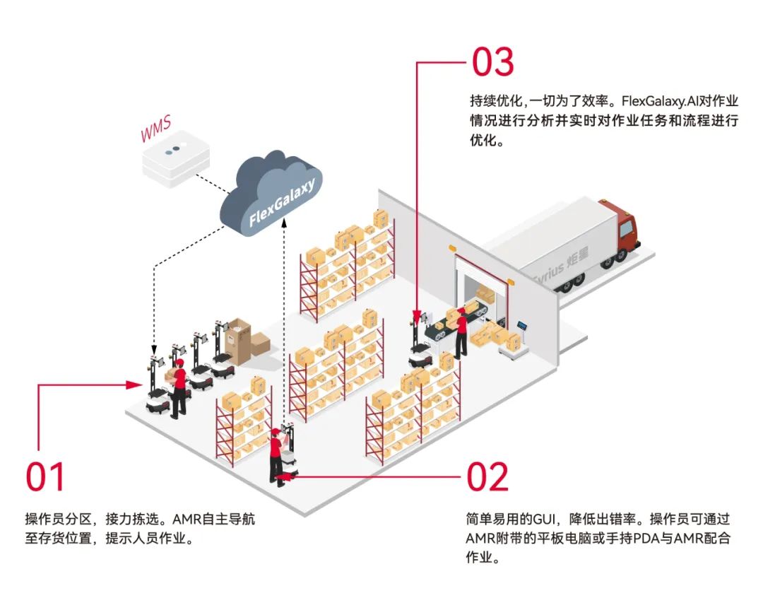 此外,在炬星科技AMR柔性揀選自動化解決方案中,AMR可進(jìn)行“接力揀選”、“人機(jī)協(xié)作”,實現(xiàn)“一人對多機(jī)”、“多機(jī)對多人”。揀貨員不再需要跑遍整個揀貨區(qū),只需在數(shù)排貨架所組成的小區(qū)域內(nèi)小范圍移動即可,由AMR串聯(lián)整個訂單的揀選流程以完成揀貨。通過減少無效行走,節(jié)約行走時間,讓揀貨員可以更專注地完成單純的揀選動作,達(dá)成提高效率的目標(biāo)。