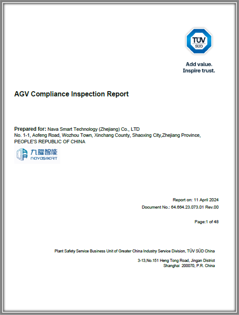 4月11日,國(guó)際知名第三方機(jī)構(gòu)TüV南德為九曜智能頒發(fā)《平衡重無(wú)人叉車(chē)PLd安全評(píng)估報(bào)告》,所有測(cè)試項(xiàng)目均一次性通過(guò),安全指標(biāo)達(dá)到甚至高于市場(chǎng)同類產(chǎn)品的安全要求,報(bào)告建議平衡重?zé)o人叉車(chē)投入實(shí)際業(yè)務(wù)運(yùn)行。