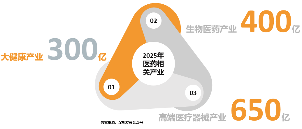 在深圳20+8產(chǎn)業(yè)集群發(fā)展行動計劃中生物醫(yī)藥、高端醫(yī)療器械、大健康三大產(chǎn)業(yè)列入重點(diǎn)發(fā)展集群。按照集群發(fā)展目標(biāo),到2025年,深圳將努力打造成為國內(nèi)領(lǐng)先、國際一流的生物與健康產(chǎn)業(yè)集聚發(fā)展高地,生物醫(yī)藥產(chǎn)業(yè)增加值要達(dá)到400億元(2021年146億元),四年增長近2倍;高端醫(yī)療器械產(chǎn)業(yè)增加值要達(dá)到650億元(2021年275億元),四年增長1.3倍;大健康產(chǎn)業(yè)增加值要達(dá)到300億元(168億元),四年增長80%。
