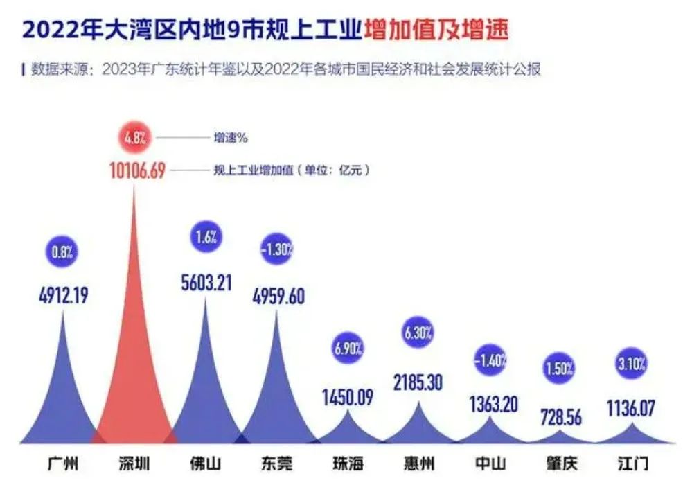 2022年大灣區(qū)內(nèi)地9市的規(guī)上工業(yè)增加值超過3萬億,占全省比重超過85%。其中,深圳、佛山、東莞、廣州作為大灣區(qū)工業(yè)發(fā)展的核心城市,2022年的規(guī)上工業(yè)增加值均在5,000億元以上或接近該數(shù)值。