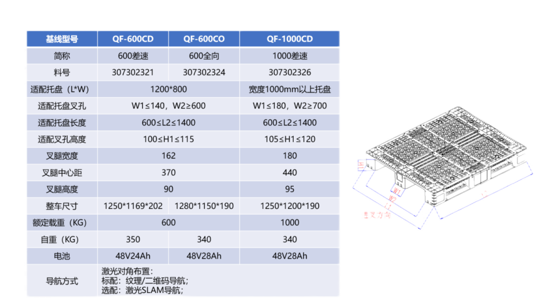 該型號標準車型最大支持載重一噸的搬運,對于棧板進叉孔預留余量較多,有良好的適應性。