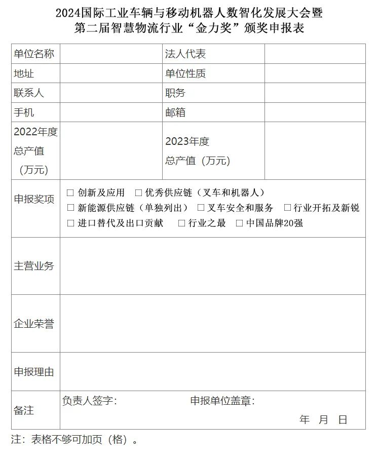 ④ 第二屆行業(yè)“金力獎”精評臻選,將以申報企業(yè)2023年度為考評范疇,貼近實(shí)際,更注重申報企業(yè)的高質(zhì)量發(fā)展、數(shù)智化轉(zhuǎn)型成果,新技術(shù)新能源的研發(fā)和應(yīng)用,揚(yáng)帆出海的出口能力等,業(yè)績斐然,標(biāo)新立異。設(shè)立:創(chuàng)新及應(yīng)用、優(yōu)秀供應(yīng)鏈(叉車和機(jī)器人)、新能源供應(yīng)鏈(單獨(dú)列出)、叉車安全和服務(wù)、行業(yè)開拓及新銳、進(jìn)口替代及出口貢獻(xiàn)、行業(yè)之最、中國品牌20強(qiáng)。(附申報表)