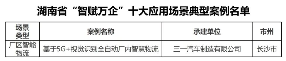 近日,湖南省工信廳發(fā)布湖南省“智賦萬企”十大應(yīng)用場景典型案例名單,三一汽車制造有限公司自主研發(fā)的“基于5G+視覺識別全自動廠內(nèi)智慧物流”入選廠區(qū)智能物流場景典型案例。