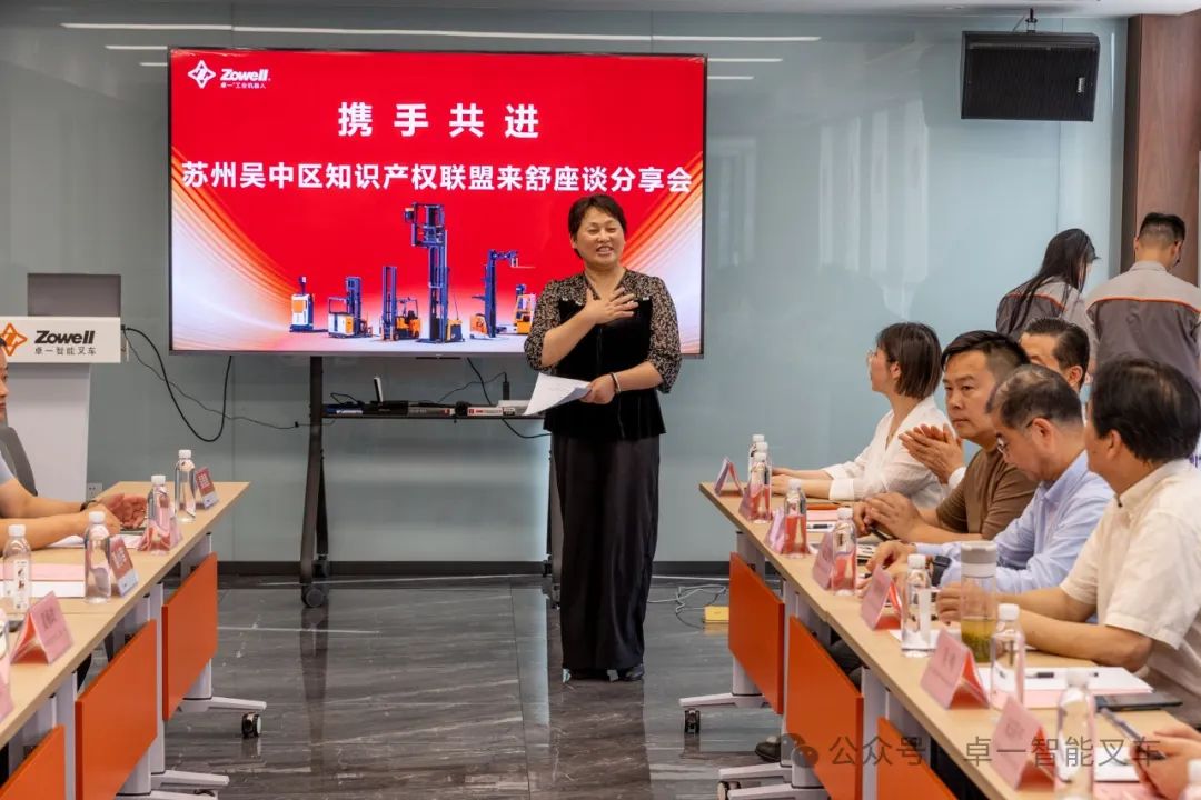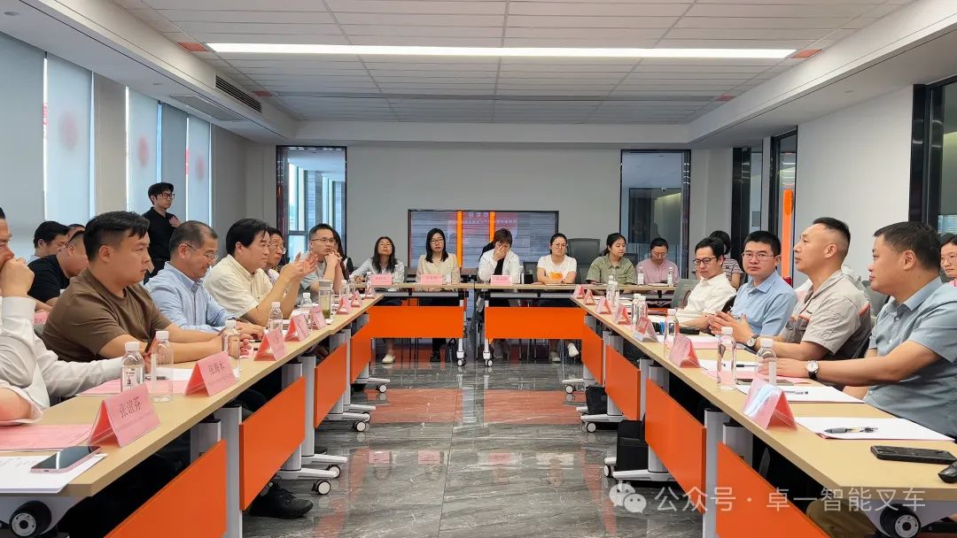座談交流會在卓一廠區(qū)會議室舉行,卓一智能叉車副總經理吳愛君致歡迎詞。