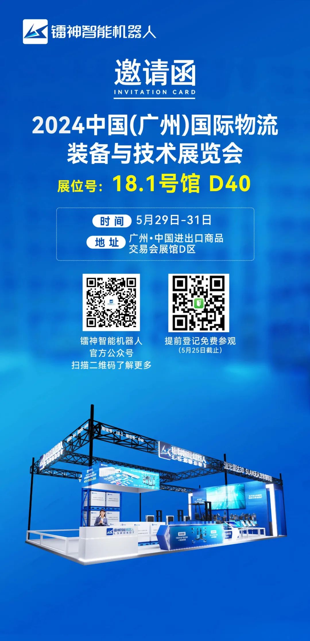 5月29日-31日,2024年中國(廣州)國際物流裝備與技術(shù)展覽會正在火熱進(jìn)行中,鐳神智能機器人誠摯邀請您蒞臨廣州·中國進(jìn)出口商品交易會展館D區(qū)18.1號館 D40展位參觀交流!