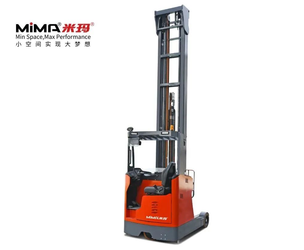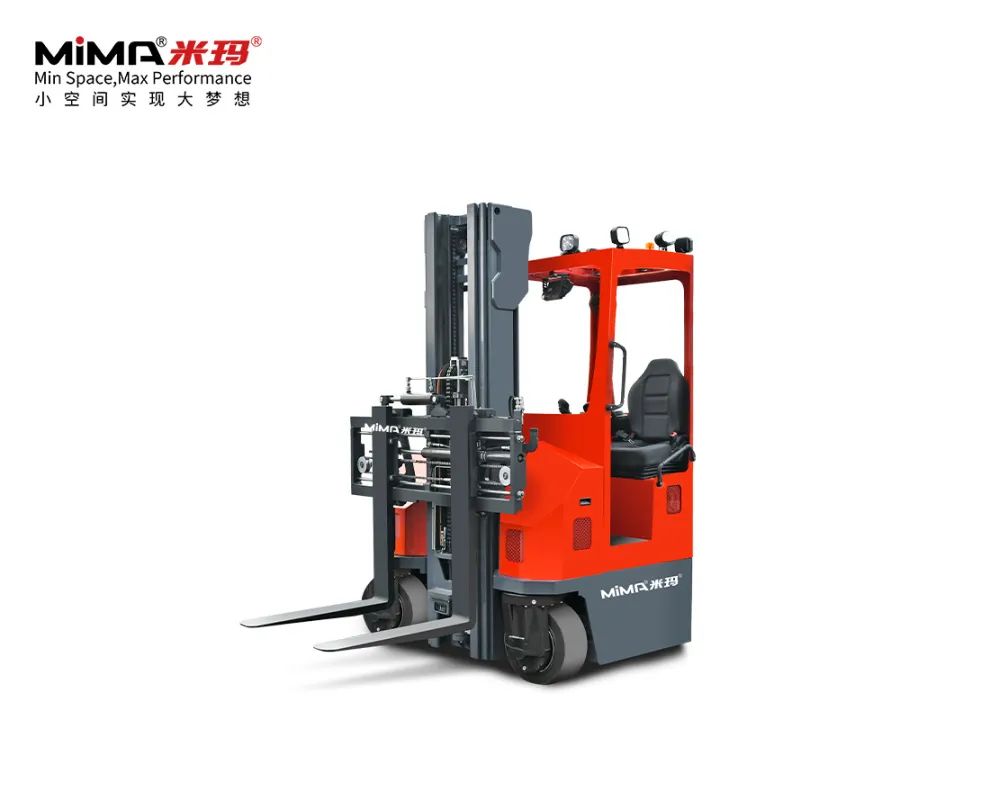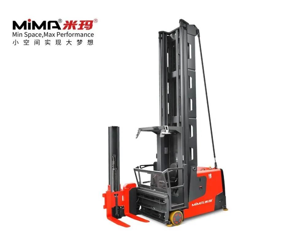 MCC16人上型三向堆垛車,額定載重1.6噸,起升高度可達14.2米,最小堆垛通道距離僅為1.65米,能實現(xiàn)超高位窄巷道密集倉儲需求。駕駛員可隨車上行進行揀選作業(yè),視野更優(yōu)越。貨叉可180°旋轉+側移,能夠充分利用倉庫空間,大幅提升庫容率。