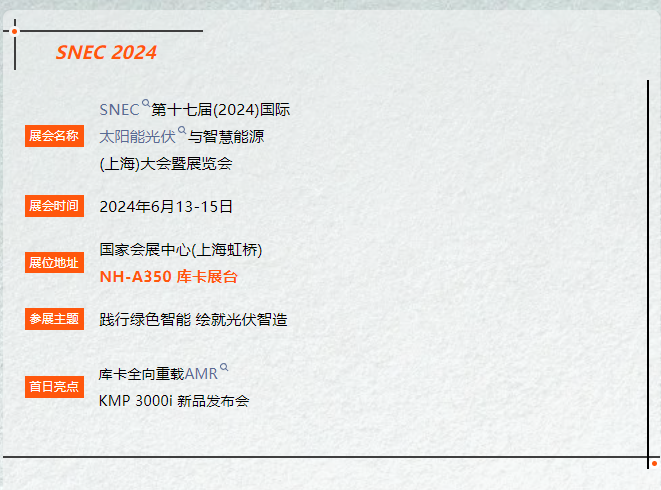 2024年6月13日,SNEC第十七屆(2024)國際太陽能光伏與智慧能源(上海)大會暨展覽會正式開幕,庫卡移動機(jī)器人攜明星產(chǎn)品KMP 600i與全向重載AMR新品KMP 3000i在NH-A350庫卡展臺亮相,與大家相聚這場權(quán)威光伏行業(yè)盛會。