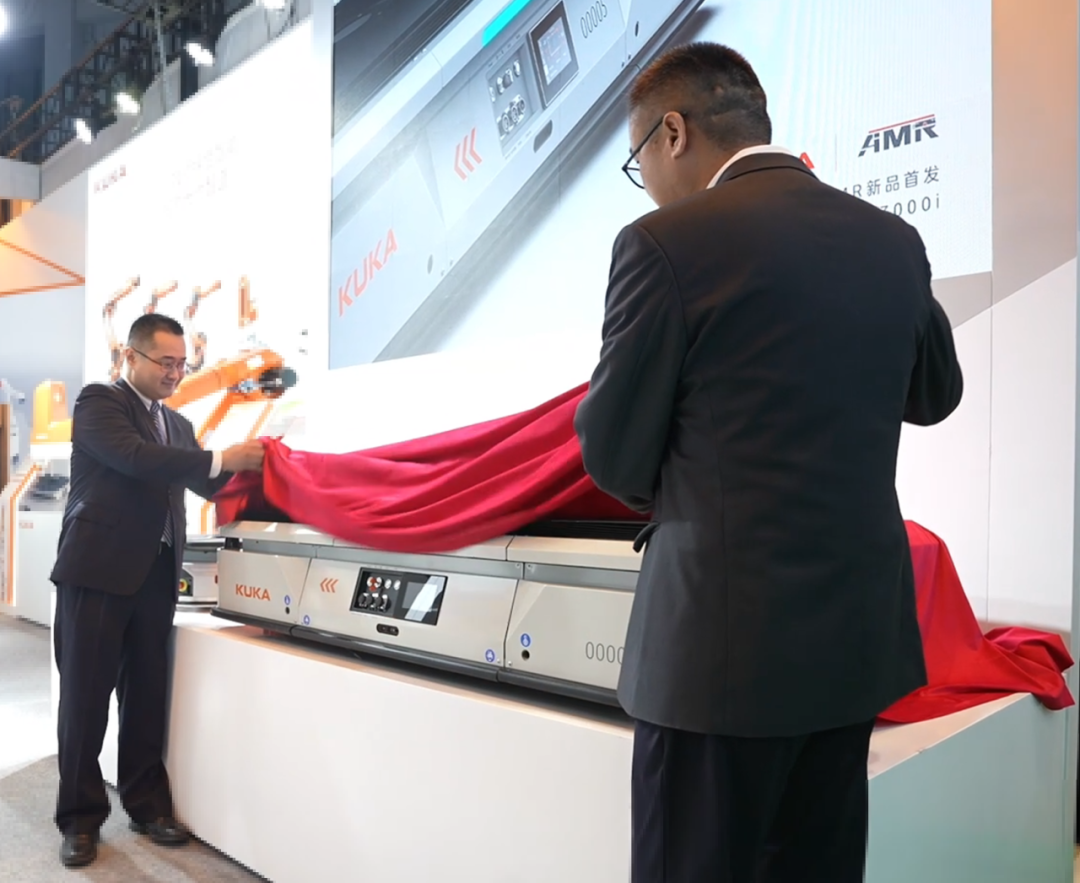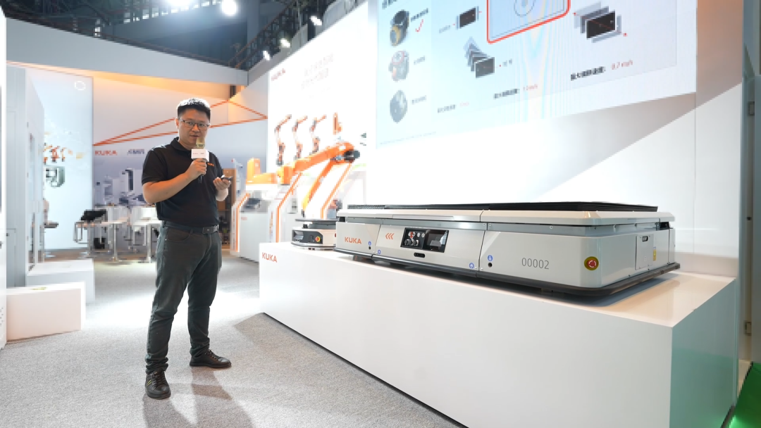 上午10:30,庫卡移動機(jī)器人產(chǎn)品企劃負(fù)責(zé)人于煬(John Yu)與方案規(guī)劃負(fù)責(zé)人景子龍(Solon Jing)出席發(fā)布儀式,一同揭開庫卡全向重載AMR新品KMP 3000i的神秘面紗。