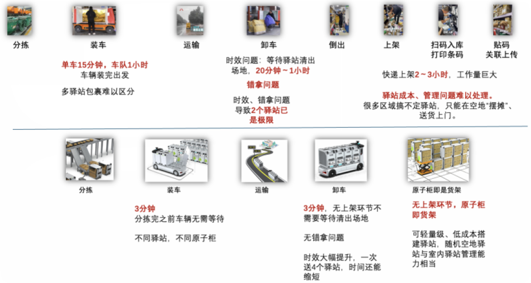 從分揀線上下來的快遞,到轉運至驛站,到用戶從驛站取走快遞,全過程都可以在原子柜完成,極大提升物流效率,傳統(tǒng)物流流程徹底重構。