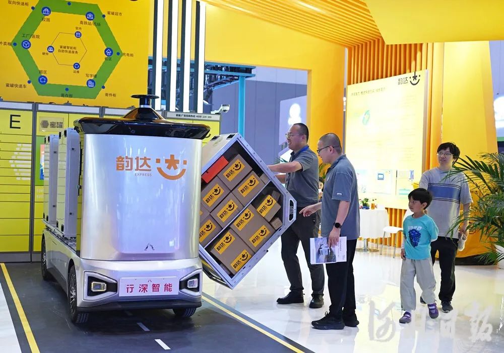 行深智能憑借多款無人車在末端物流領域顯著的降本增效能力,以及全球范圍內超過600家企業(yè)的信賴和成功應用案例,受邀亮相本次廊洽會的展示舞臺。在展會現(xiàn)場,行深智能矚目展出其最新發(fā)布的末端配送新旗艦——“換熊”無人車,因其出色的顏值,及對末端物流配送流程的顛覆性創(chuàng)新和優(yōu)化,吸引政府領導、快遞業(yè)精英、參展嘉賓及廣大觀眾的熱烈關注,成為本次廊洽會智能物流展上的一大亮點。