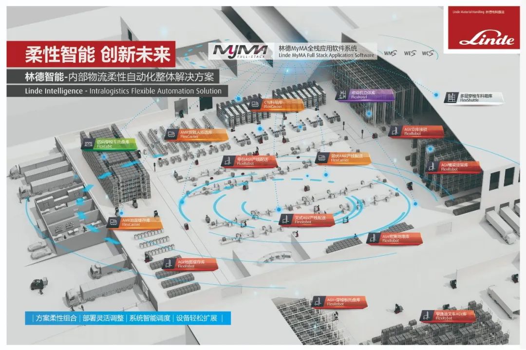 從頂層的應(yīng)用軟件系統(tǒng)到調(diào)度系統(tǒng),再到執(zhí)行搬運(yùn)任務(wù)的物流設(shè)備,林德智能為客戶提供端到端的整體解決方案,打造一體化全棧式創(chuàng)新交付平臺。林德智能內(nèi)部物流柔性自動化系統(tǒng)包括:自主研發(fā)的上位系統(tǒng)MyMA全棧應(yīng)用軟件(WMS/WES/WCS等)、移動設(shè)備調(diào)度系統(tǒng)E'tricc以及Flex系列移動自動化硬件產(chǎn)品,如FlexRobot叉式托盤搬運(yùn)存取機(jī)器人,F(xiàn)lexCarrier潛伏及箱式搬運(yùn)存揀機(jī)器人,F(xiàn)lexCube四向穿梭車,F(xiàn)lexHotel堆垛機(jī)立體庫,F(xiàn)lexShuttle多層穿梭車料箱庫等。