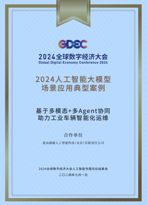 7月1日,2024全球數(shù)字經(jīng)濟(jì)大會(huì)人工智能專題論壇在中關(guān)村國家自主創(chuàng)新示范區(qū)會(huì)議中心成功召開。本次論壇以“應(yīng)用即未來——大模型賦能千行百業(yè),新生態(tài)擁抱產(chǎn)業(yè)未來”為主題,匯聚了政府、企業(yè)和學(xué)術(shù)界的專家,共同探討大模型技術(shù)在各行業(yè)中的應(yīng)用。論壇上,備受矚目的“2024人工智能大模型場(chǎng)景應(yīng)用典型案例”正式發(fā)布,其中愛動(dòng)超越開發(fā)的“基于多模態(tài)+多Agent協(xié)同助力工業(yè)車輛智能化運(yùn)維場(chǎng)景應(yīng)用”成功入圍,成為這一領(lǐng)域的耀眼明星。