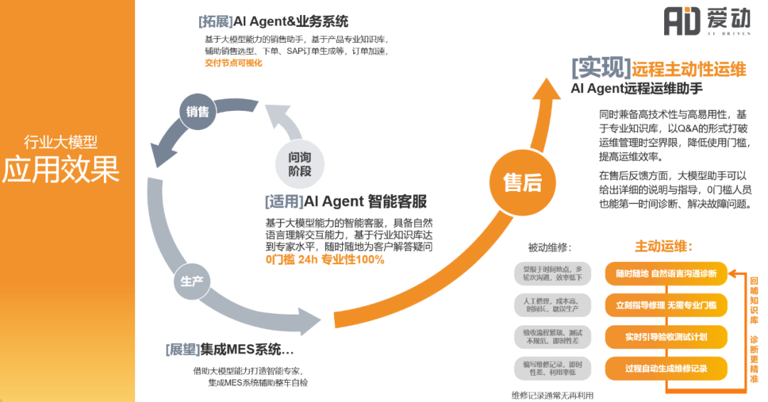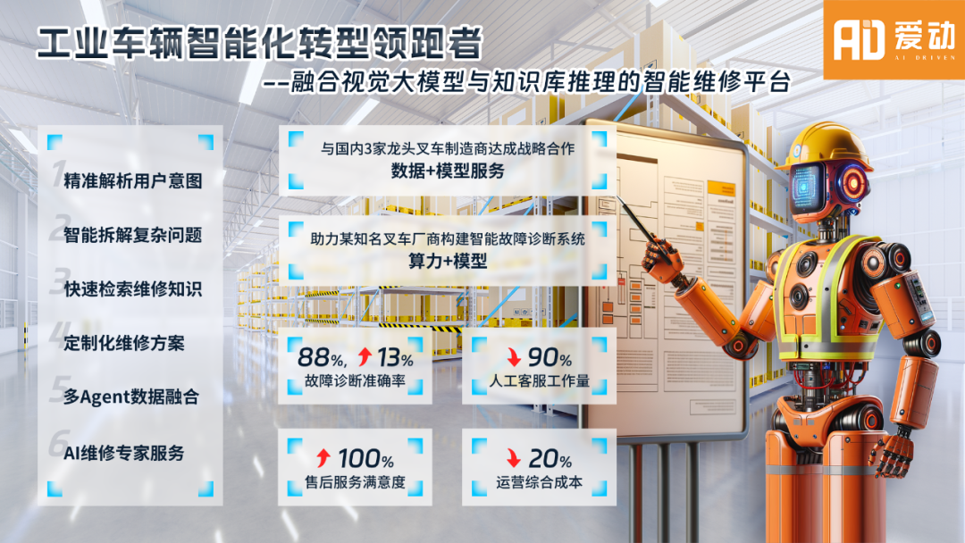愛動(dòng)超越憑借著在工業(yè)車輛智能化運(yùn)維方面的創(chuàng)新應(yīng)用,融合視覺大模型與知識(shí)庫推理技術(shù)自主研發(fā)的大模型+Agent在工業(yè)車輛智能運(yùn)維場(chǎng)景。在售前服務(wù)應(yīng)用前景中主要通過配置優(yōu)化、市場(chǎng)預(yù)測(cè)、分析和虛擬展示提升客戶滿意度,縮短銷售周期,提升市場(chǎng)占有率。提供智能推薦配置方案,市場(chǎng)趨勢(shì)分析和精準(zhǔn)策略建議,利用VR/AR技術(shù)實(shí)現(xiàn)虛擬試駕體驗(yàn)。大模型在售后服務(wù)上提供智能故障診斷、預(yù)測(cè)維護(hù)、遠(yuǎn)程運(yùn)維和技術(shù)支持?;贏gent的智能客服系統(tǒng)優(yōu)化用戶行為分析和服務(wù),管理備件庫存,提升服務(wù)流程和供應(yīng)鏈效率。