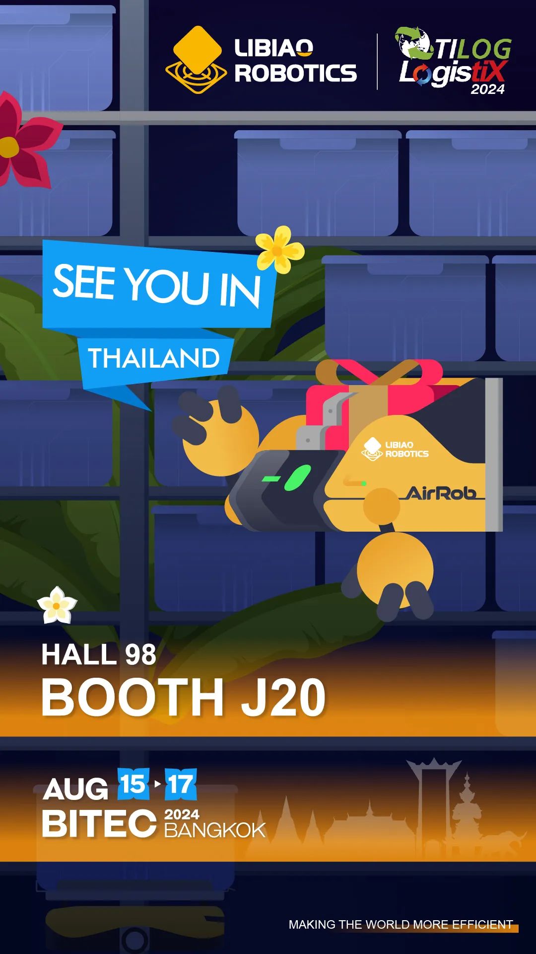 8月15日至17日,立鏢海外精英團(tuán)隊(duì)將奔赴泰國(guó),參加亮相TILOG LOGISTIX——泰國(guó)國(guó)際倉(cāng)儲(chǔ)設(shè)備及物流展覽會(huì)。此次參展,立鏢將攜其創(chuàng)新力作AirRob飛箱系統(tǒng)、明星產(chǎn)品“小黃人”、T-sort、3D分揀物流解決方案亮相,全方位展示其在倉(cāng)儲(chǔ)自動(dòng)化與物流智能化領(lǐng)域的創(chuàng)新成就。