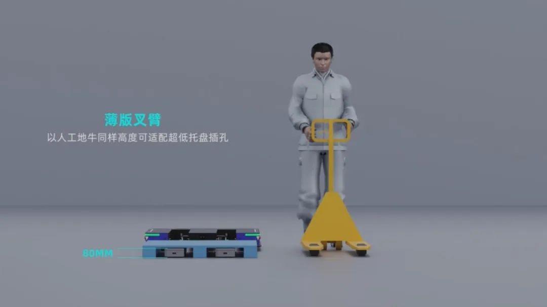 突破機械結(jié)構(gòu)的極限,APR叉臂的厚度做到80mm,叉臂的厚度與叉車貨叉的厚度近似,以人工地牛同樣高度可適配超低托盤插孔,托盤的適應(yīng)性更強。