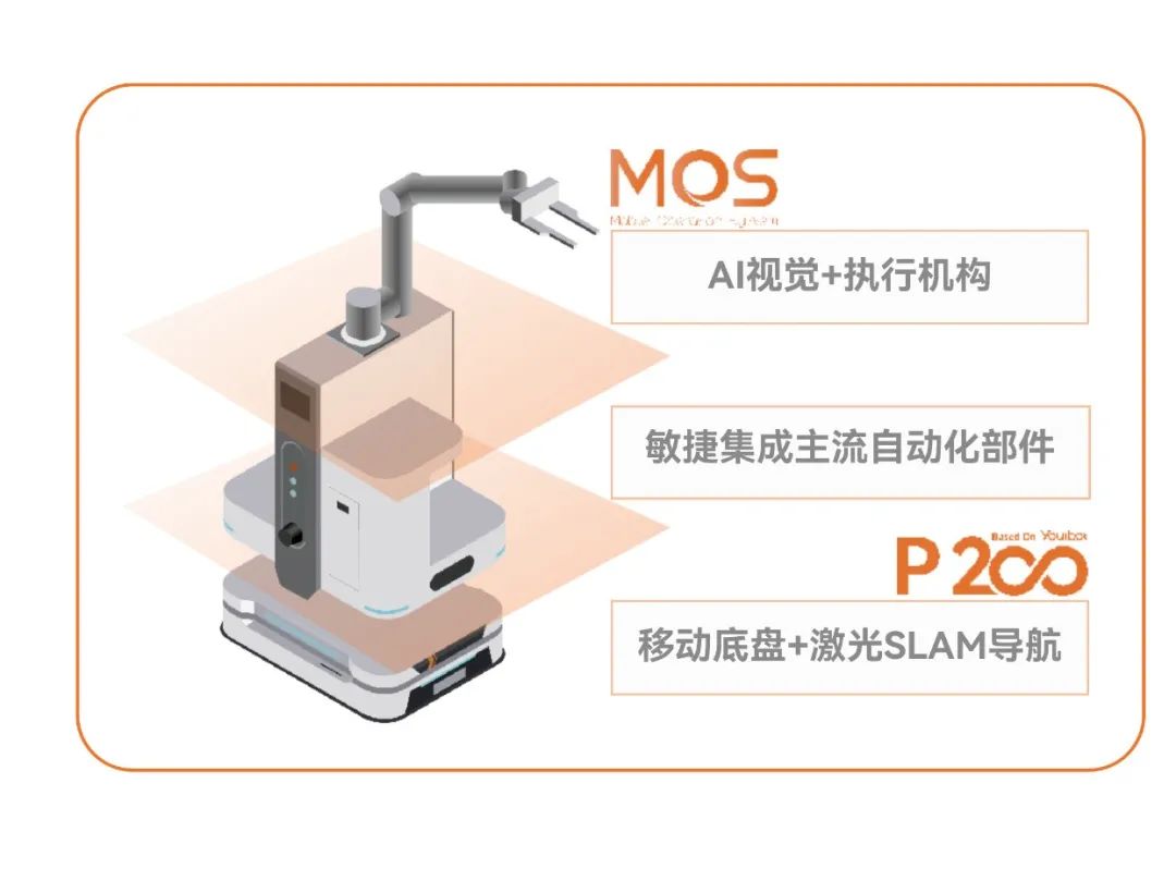 MOS系統(tǒng)提供了完備的通信接口及外部系統(tǒng)對接方案,其標準化與通用化的特性,使復合移動機器人能夠依據場景敏捷集成各類機械臂、傳感器等上執(zhí)行操作機構。