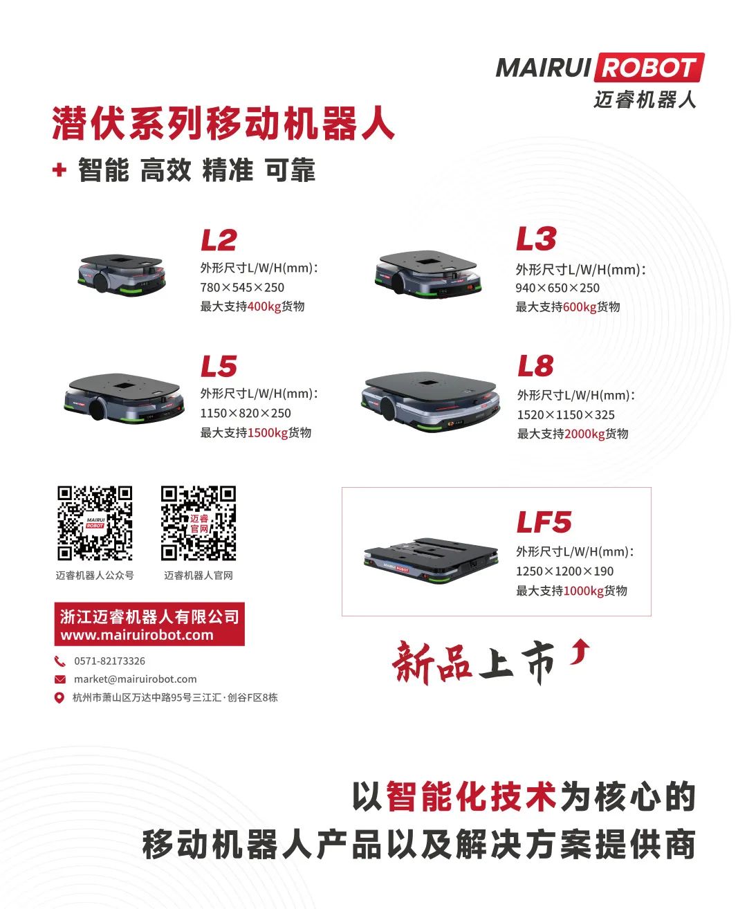 目前邁睿機器人的潛伏叉取系列移動機器人LF5新品上市,適配國標托盤、非標托盤、非標料框等多種載具,用于物流分撥、地滾線對接、托盤到人和拆碼垛機自動對接等場景,可和地滾線、提升機、貨梯、風淋門等設(shè)備直接交互,實現(xiàn)自動、高效搬運。
