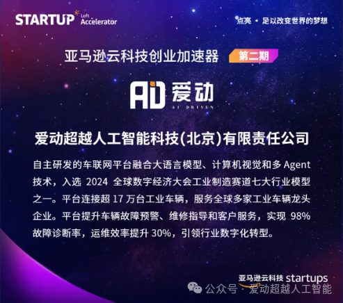 在全球化的浪潮中,技術(shù)的力量不斷推動(dòng)著各行各業(yè)的革新與進(jìn)步。我們榮幸地宣布,愛動(dòng)超越憑借在車聯(lián)網(wǎng)大模型應(yīng)用層的創(chuàng)新成就,已成功加入亞馬遜云科技創(chuàng)業(yè)加速器第二期(生成式 AI)。愛動(dòng)超越將作為車聯(lián)網(wǎng)大模型、計(jì)算機(jī)視覺和多 Agent 技術(shù)應(yīng)用層公司代表,與其他入選的30家初創(chuàng)企業(yè)共同參與為期10周的課程賦能,完成與亞馬遜云科技全球創(chuàng)投網(wǎng)絡(luò)和業(yè)務(wù)拓展等資源的全方位對接。