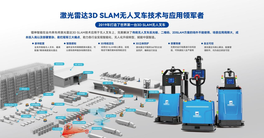 鐳神智能于2017年起投入研發(fā)激光雷達(dá)3D SLAM技術(shù),2019年打造世界第一臺3D SLAM無人叉車,2023年正式推出鐳神智能機(jī)器人品牌,致力于研發(fā)生產(chǎn)基于激光雷達(dá)3D SLAM技術(shù)的無人系統(tǒng)設(shè)備及無人化系統(tǒng)解決方案,自研的3D SLAM無人叉車、AGV平臺在硬件方面擁有全球最高頂級配置,配置了7顆自研的激光雷達(dá)和1顆高精定位慣導(dǎo),打造了世界領(lǐng)先的3D SLAM無人叉車系列產(chǎn)品及智能制造與智慧物流無人化系統(tǒng)解決方案,完美解決了傳統(tǒng)無人叉車反光板、二維碼、2D SLAM方案的場外不能使用、場景應(yīng)用局限大,成本投入高以及部署繁雜、易爛尾等三大痛點(diǎn),可應(yīng)用于工廠自動化、倉儲自動化、港口自動化等應(yīng)用場景,助力各行業(yè)快速實現(xiàn)智能化、無人化升級轉(zhuǎn)型,賦能中國智造。