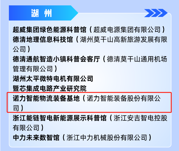 今日,省科協(xié)科普部、省科企新質(zhì)生產(chǎn)力研究院公布首批浙江省新質(zhì)生產(chǎn)力科普體驗館(點)認定名單,諾力智能物流裝備基地榜上有名。