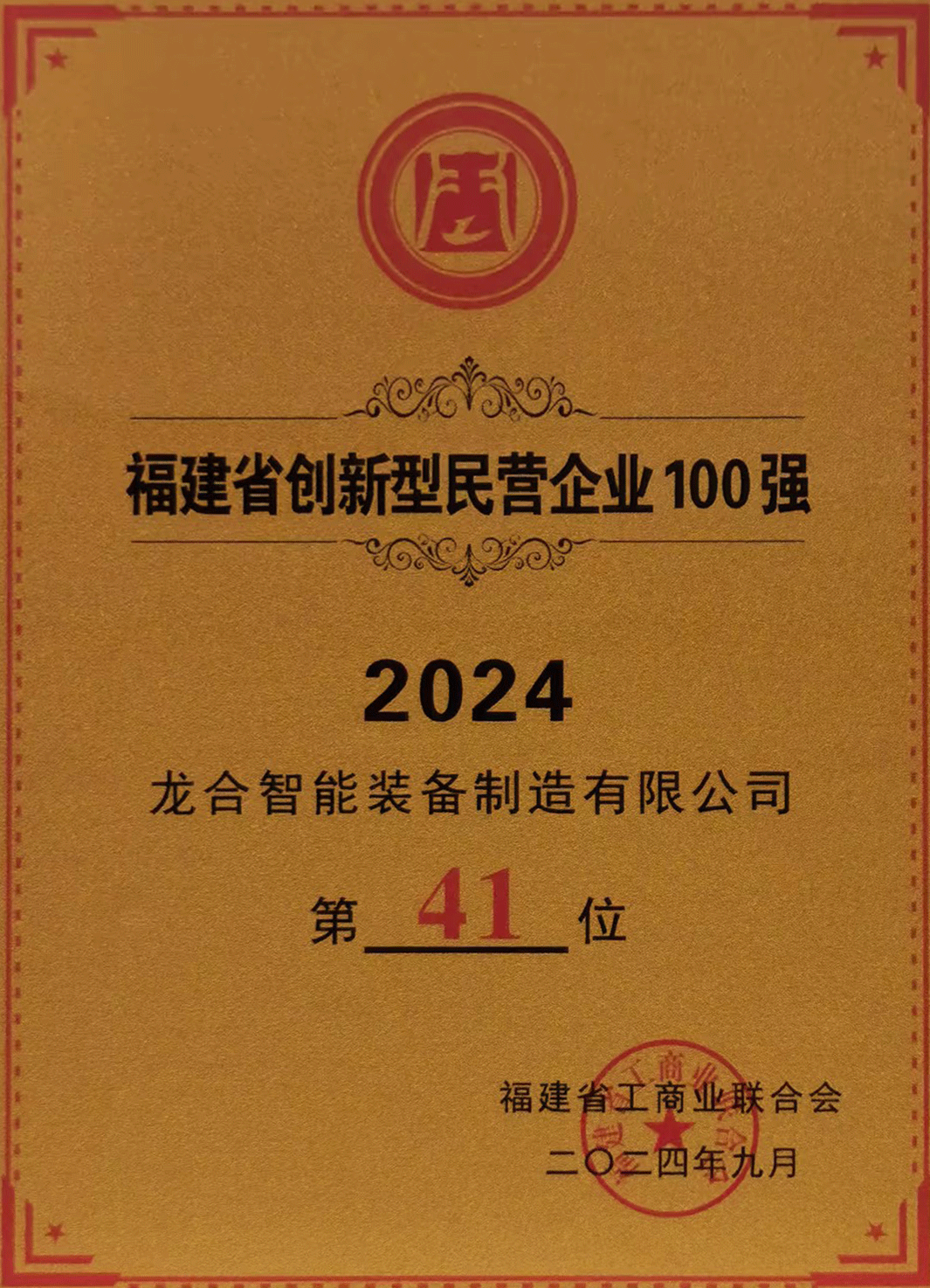 9月19日,2024福建民營企業(yè)100強(qiáng)發(fā)布會召開,大會頒布了2024福建省創(chuàng)新型民營企業(yè)百強(qiáng)榜單并進(jìn)行授牌,龍合智能憑借出色的創(chuàng)新實(shí)力和卓越的經(jīng)營業(yè)績,再次脫穎而出,榮登福建省創(chuàng)新型民營企業(yè)100強(qiáng)第41位。