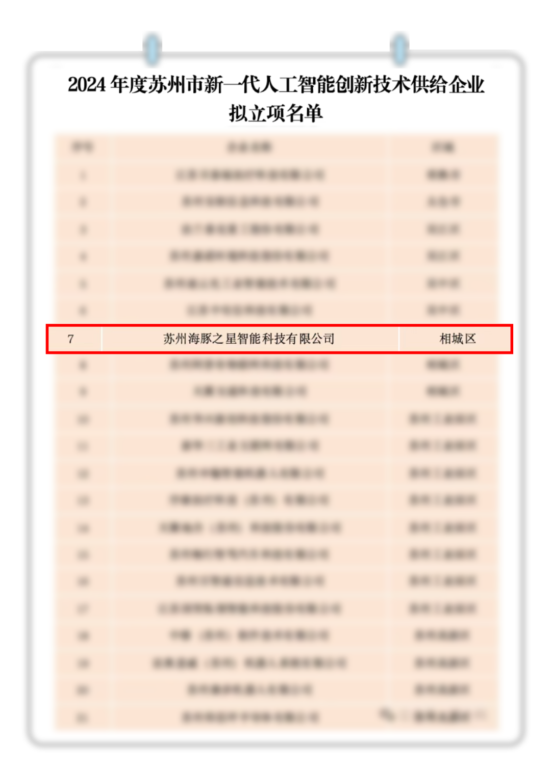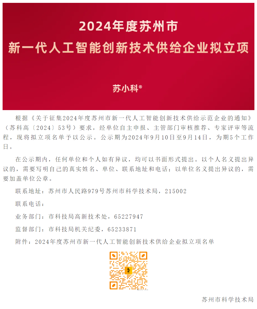 根據(jù)《關(guān)于征集2024年度蘇州市新一代人工智能創(chuàng)新技術(shù)供給示范企業(yè)的通知》(蘇科高〔2024〕53號)要求,經(jīng)單位自主申報(bào)、主管部門審核推薦、專家評審等流程,現(xiàn)將擬立項(xiàng)名單予以公示。(現(xiàn)已結(jié)束)