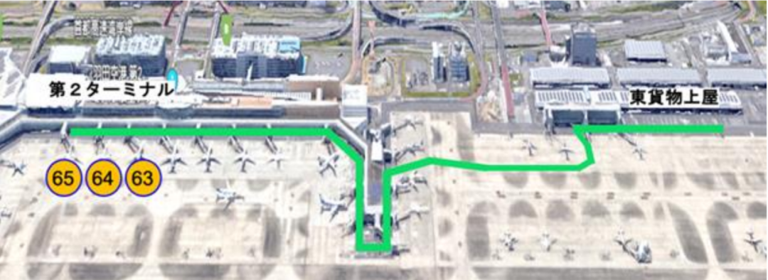 本次試驗,牽引車后連結(jié)6個貨物車廂,長度約25米。行駛路線為連接國內(nèi)線第2候機樓的63?64?65號停車位和東貨物倉庫的約2公里單程路線。