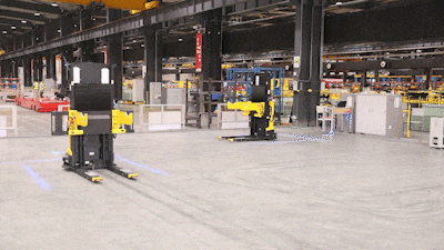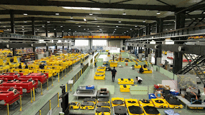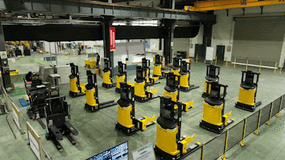 百余臺(tái)移動(dòng)機(jī)器人在車間內(nèi) 整齊列陣、蓄勢待發(fā)▼